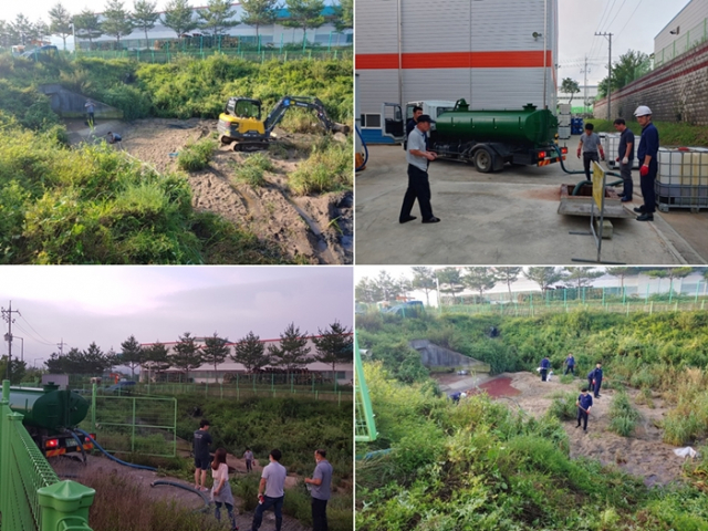 14일 오전 9시경, 수거차량을 동원하여 저류지 내 잔여 오염물질 및 오염된 토양 등을 수거·처리 완료하였으며 만일의 사태를 대비하여 인근 소하천 하천수를 채수하여 수질검사를 의뢰한 상태이다.