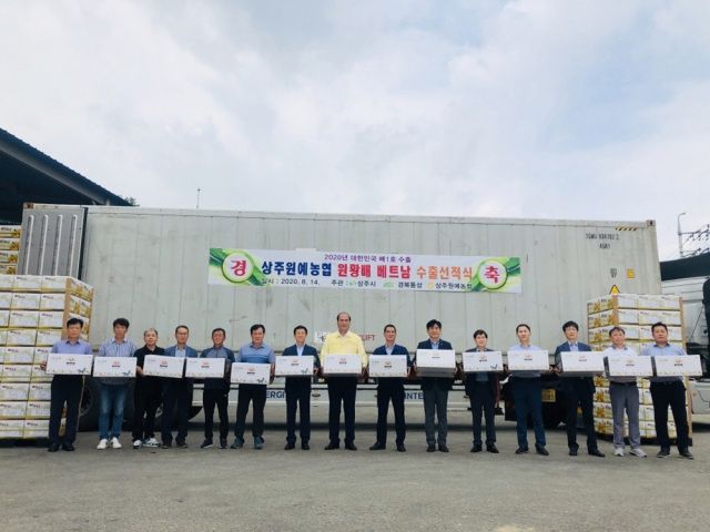 상주원예농협(조합장 이한우)은 지난 8월 14일 오전 11시 회원 농가, 수출 관계자, 상주시장 등이 참석한 가운데 올해 수확한 원황 배의 첫 수출 기념식을 가졌다.