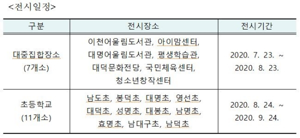 전시장소는 남구 내 초등학교 11개소와 구립도서관, 아이맘센터, 평생학습관, 대덕문화전당 등 다중집합장소 7개소이며, 내달 24일까지 진행된다.