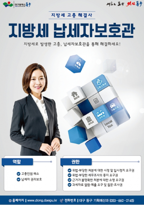 ‘납세자보호관’ 서비스와 ‘기업에 대한 지방세 지원제도’에 관한 자세한 사항은 동구청 기획예산과 납세자보호관에게 유선(☎662-2145) 또는 방문문의하면 된다.
