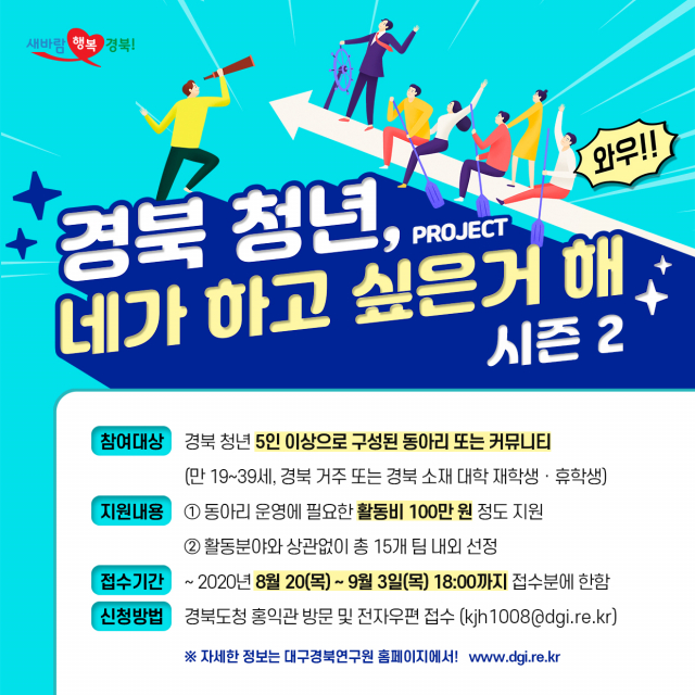 경북도내 만19세 이상 만39세 이하의 경북 거주 청년으로 구성된 5인 이상의 동아리․단체에서 신청할 수 있으며, 팀당 100만원 정도 지원을 받게 된다.