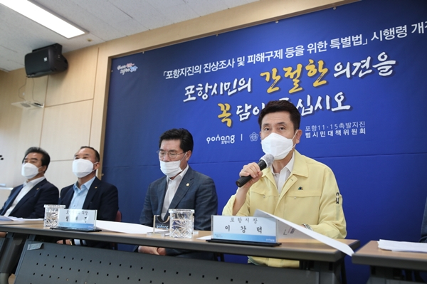 정해종 포항시의회 의장도 “시행령은 촉발지진의 진상규명은 물론, 지난 3년간의 상처를 딛고 시민들이 일상으로 돌아갈 수 있도록 실질적인 피해구제와 함께 지역경제 활성화 및 공동체 회복을 위한 충분한 지원이 담겨야 한다.”고 강조했다.
