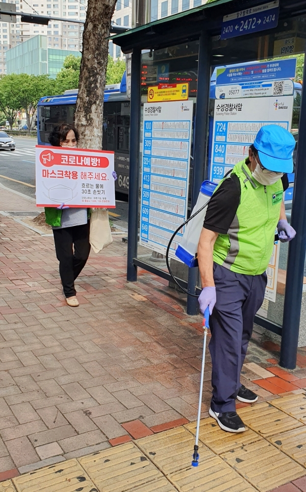 대구 수성구(구청장 김대권)는 지난 24일 제7기 수성구 생활공감정책참여단이 코로나19 감염 예방을 위해 버스정류장 방역과 캠페인을 실시했다고 밝혔다.