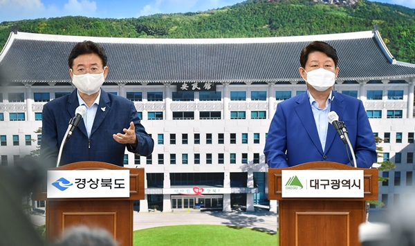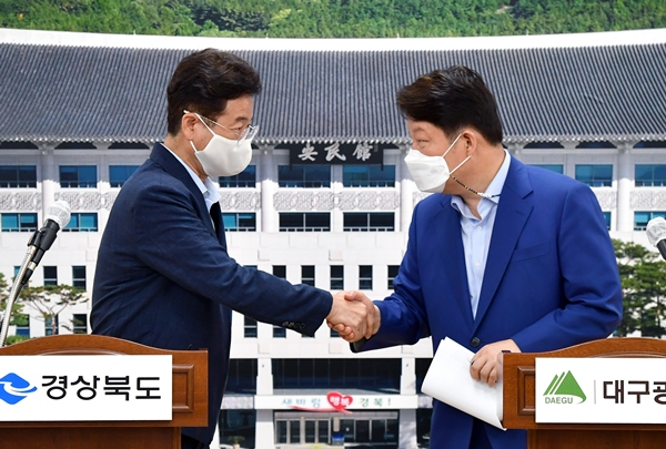 이철우 경북도지사와 권영진 대구시장은 지난 8월 25일 도청 브리핑룸에서 통합신공항 이전지 선정 관련 공동합의문과 호소문을 발표했다.