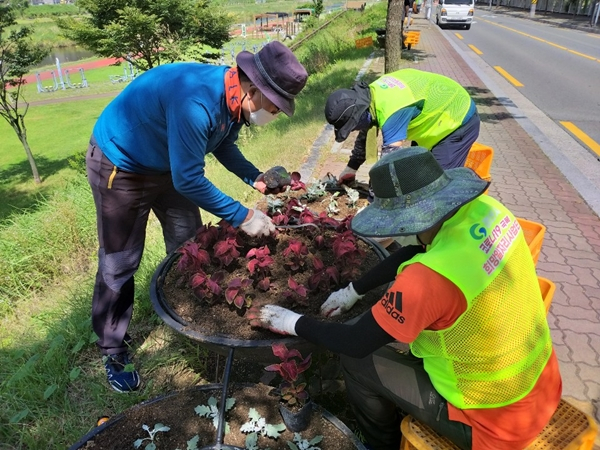 북부동행정복지센터(동장 정영주)는 롯데시네마 앞 남천 강변 동로변에 여름을 맞이하였던 메리골드와 백일홍을 거두고 가을을 장식할 코리우스와 백묘국을 심었다.
