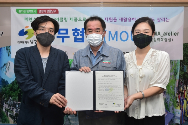 대구광역시 남구청(구청장 조재구)은 지난 25일 남구청 2층 회의실에서 엄마작업실[mama atrier](공동대표 라채형, 박정미)과 폐현수막 재활용을 위한 협약을 체결했다.