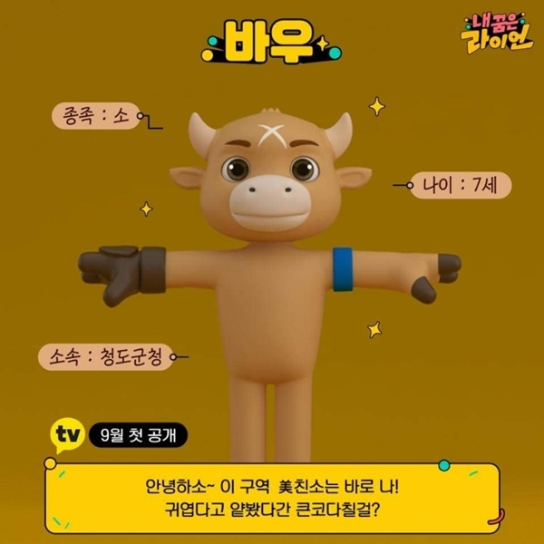 청도군(이승율 군수)은 소를 형상한 청도군 캐릭터 ‘바우’가 9월1일 카카오TV에서 첫 공개되는 카카오M 오리지널 디지털 예능 <내 꿈은 라이언>에 출연한다고 밝혔다.