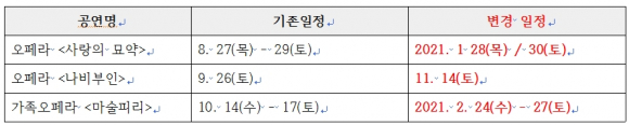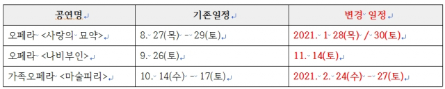<2020 대구오페라축제>의 주된 변경 사항은 크게 두 가지다. 첫 번째로, <사랑의 묘약(8.27/29)>과 <나비부인(9.26)> 등 전막오페라와 가족오페라 <마술피리(10.17)>의 공연 일정이 가깝게는 연말, 멀리는 내년 초로 연기돼 해당 공연을 예매한 관객들의 아쉬움을 달랠 예정이다.