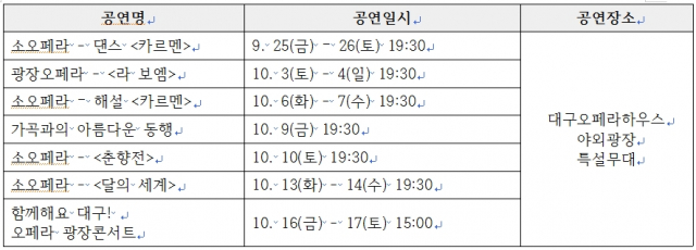 두 번째는 출연진과 제작진, 관객까지 모두의 안전을 담보하기 위해 ‘야외공연’ 형태로 프로그램들이 재구성된다는 점이다. 대상은 소오페라와 광장오페라, 콘서트까지 총 7편으로, 9월 25일에서 10월 17일 중 총 12회 공연된다. 대구오페라하우스는 이를 위해 극장 전면에 위치한 야외광장에 무대를 설치, 프로그램별 특성에 따라 가변적으로 최대한 다양하게 활용할 수 있도록 할 계획이다. 상세 일정은 아래와 같다.