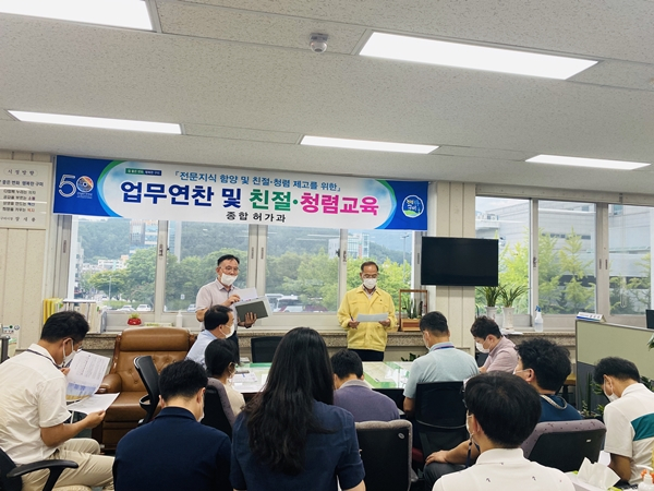 이 날 교육은 인·허가별 관련법에 근거한 공정한 업무 처리, 업무에 대한 충분한 설명과 이해, 친절한 민원응대 등 친절을 기본으로 청렴마인드 함양과 실천, 또한 각 업무처리별 법령개정 및 변경사항 등에 대해 충분히 검토하고 숙지하는 자리가 되었으며, 아울러 코로나19가 확산 증가됨에 따라 민원인 응대 시 마스크 착용, 손 소독 등 사무실 내에서 철저한 위생 관리 수칙을 준수할 것을 강조하였다.