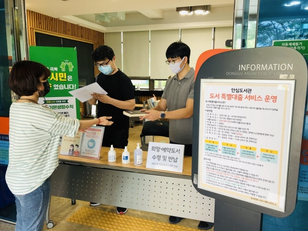 (재)동구문화재단 안심도서관과 신천도서관은 코로나19 재확산으로 도서관 출입이 제한되면서 모든 대면 도서관서비스는 중단되었으나, 주민 불편을 해소하기 위해 도서 특별대출 서비스를 제공한다.