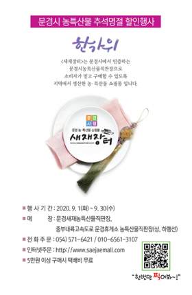 문경시는 코로나19 재확산에 따라 지역경제를 살리기 위해 추석명절을 앞두고 지난 9월 1일부터 9월 30일까지 문경시 농·특산물 추석 명절선물 동행세일을 실시한다.