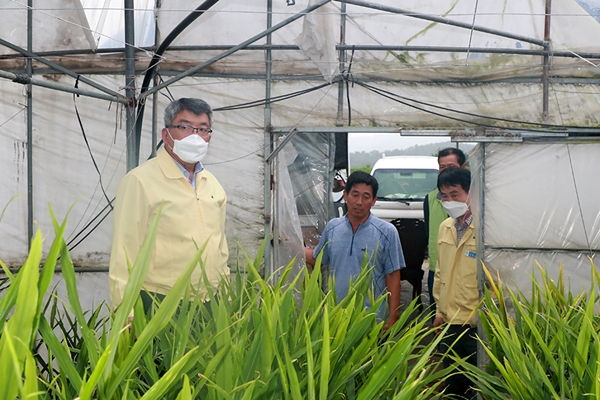 김학동 예천군수는 2일 오후 2시 제9호 태풍 ‘마이삭’이 우리나라 턱밑까지 북상하고 있는 가운데 태풍 피해가 우려되는 농경지, 시설하우스 등 취약시설 현장점검에 나섰다.