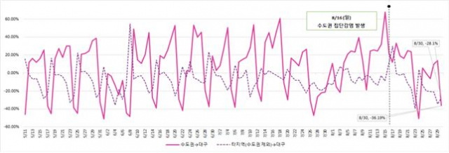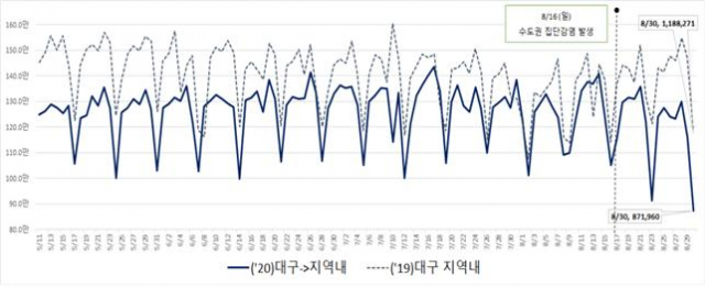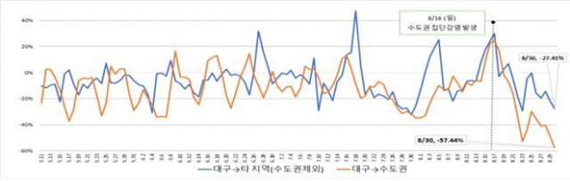 대구에서 수도권으로 이동은 수도권에서 코로나19 환자가 연일 200명 이상 발생하던 8월22일 경부터 확연히 줄어들기 시작하면서 최근 일주일(8.24~30) 사이 전년보다 42%나 급감하였다. 반면 수도권을 제외한 타 지역 이동은 동일 기간에 15% 줄어들어 대구 시민들이 타 지역보다 수도권 이동을 더욱 자제한 것으로 분석된다.