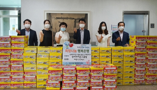 국제라이온스협회356-A(대구)지구 제6지역 경아라이온스클럽(회장 안유민)은 지난 2일 수성구 고산2동 행정복지센터를 방문해 추석을 맞아 행복나눔 곳간을 이용하는 어려운 이웃들을 위해 써달라며 라면 120박스(120만 원 상당)을 전달했다.