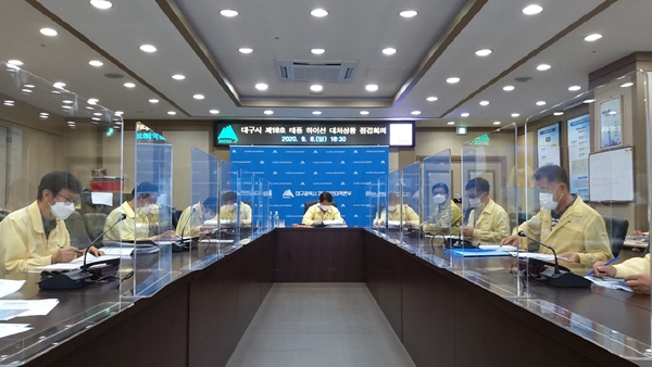 권영진 대구시장은 제10호 태풍 ‘하이선’이 9월 7일 대구 지역에 직접적인 영향을 줄 것으로 예상됨에 따라 지난 9월 6일 오후 4시 30분 관련 부서장 및 구·군 부단체장이 참여한 가운데 태풍대처 상황 점검회의를 열고 대처상항을 점검했다.