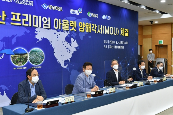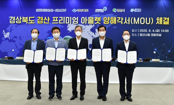 경산시는 지난 9월 4일 경산시청 대회의실에서 최영조 경산시장, 이철우 경상북도지사, 최삼룡 대구경북경제자유구역청장, 조창현 ㈜신세계사이먼 대표, 김상열 경산지식산업개발(주) 대표와 윤두현 국회의원, 이기동 경산시의회 의장이 참석한 가운데 경산 프리미엄 아울렛 조성을 위한 투자유치 양해각서(MOU)를 체결했다.