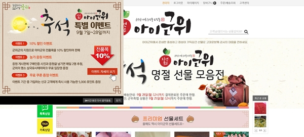 군위군(군수 김영만)은 다가오는 추석명절을 맞이하여 군위 농·특산물 대표 쇼핑몰인 아이군위(https://igunwi.gunwi.go.kr/)에서 판매 전품목 10% 할인, 신규 회원 적립금 지급, 응원 글쓰기 이벤트 등을 9월 7일부터 28일까지 22일간 진행할 예정이다.