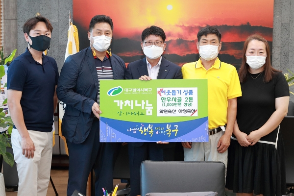 화원축산(대표 김우석)ᐧ아성축산(대표 김선주)은 9월 4일(금) 북구청을 방문하여 관내 저소득층을 위해 1,000만 원 상당의 한우사골 2톤(20kg 100박스)을 후원했다.