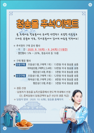 청송군(군수 윤경희)이 운영하고 있는 온라인 쇼핑몰인 청송몰에서 9월 10일부터 추석을 맞아 가격할인 등 이벤트를 실시한다.