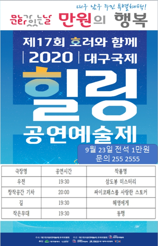 이번 행사는 대명공연거리에서 대구연극협회(남구 대명동 소재)가 주관하는 ‘힐링 공연예술제’에 참가하는 소극장 작품들을 대상으로 1인 관람권을 1만원에 제공하는 ‘만원의 행복’ 이벤트로 진행된다.
