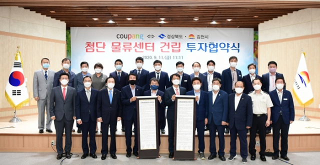 김천시(시장 김충섭)와 경상북도(도지사 이철우)는 9월 11일 오전 11시 11분 김천시청 3층 강당에서 김충섭 김천시장과 이철우 경상북도지사, 쿠팡(주) 박대준 대표 등 40여명이 참석한 가운데 첨단 물류센터 건립을 위한 투자양해각서를 체결했다고 밝혔다.