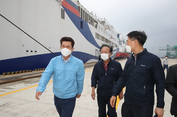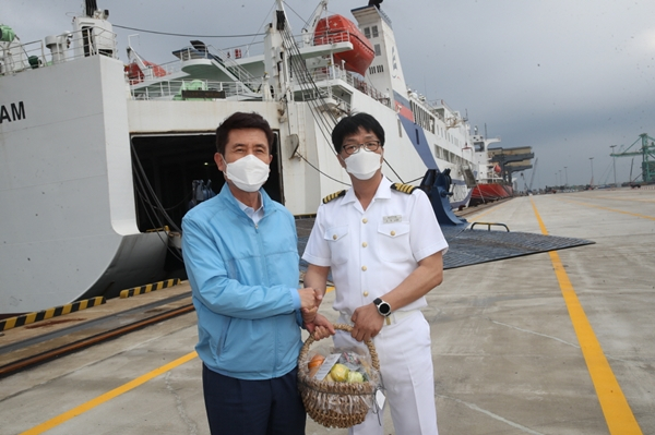 이강덕 포항시장은 카페리의 첫 출항에 맞춰 영일만항 컨테이너 부두를 방문하여 입출항과 관련하여 선박 안전 등 현장의 제반 상황을 점검하고 관계자들을 격려했다.