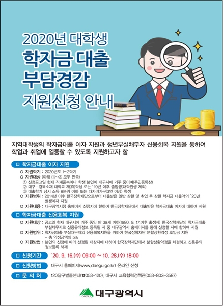 대구시는 지역 청년들이 경제적 부담을 덜고 학업과 취업에 전념할 수 있도록 한국장학재단에서 대출 받은 학자금의 이자 지원 신청과 학자금 대출로 인해 신용유의자가 된 청년의 신용회복 지원 신청의 접수를 오는 9월 16일부터 시작한다.