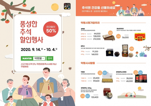대구약령시 한방제품 특화몰인 ‘동대구역 메디시티대구 명품브랜드 판매장’(이하 메디시티대구 판매장)과 인터넷 쇼핑몰 ‘대구약령몰’(이하 약령몰)에서 우수・인기 한방제품을 선별해 2020년 추석맞이 특별 할인 행사를 개최한다.