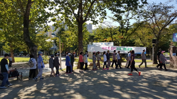 바르게 걷기 프로그램은 사회적 거리두기 등으로 신체활동이 부족한 지역주민을 대상으로 매주 월·목요일 오후 4시부터 화랑공원(만촌동 소재)에서 진행한다. 걷기 전문강사가 스트레칭, 보행분석을 통한 올바른 걷기자세, 근력운동 등 지도한다. 모바일 앱 ‘워크온’을 통해 건강정보도 제공하고 걷기실천 모니터링도 실시한다.