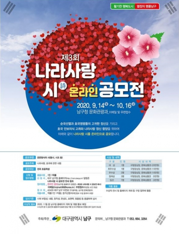나라사랑 시 공모전에 관한 자세한 사항은 남구청 문화관광과(☎053-664-3264)로 문의하면 된다.