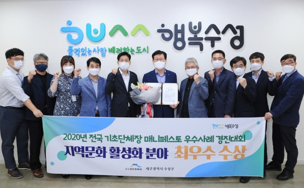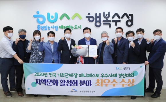 대구 수성구(구청장 김대권)는 한국매니페스토실천본부와 경기연구원이 공동주최한 ‘2020 전국 기초단체장 매니페스토 우수사례 경진대회’에서 지역문화 활성화 분야 최우수상을 수상했다고 16일 밝혔다.