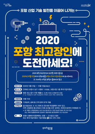 포항시는 지역 산업현장에 종사하는 숙련기술자들이 긍지와 자부심을 가지고 산업발전 및 지역경제 활성화에 이바지할 수 있도록 ‘2020년 포항시 최고장인’을 선정할 계획이다.