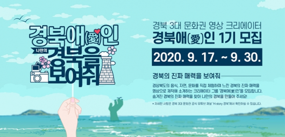 경상북도와 경상북도문화관광공사는 9월 17일부터 30일까지 경상북도 3대 문화권의 진짜 매력을 영상 콘텐츠로 제작해 소개하는 크리에이터 그룹 ‘경북애(愛)인’을 모집한다.