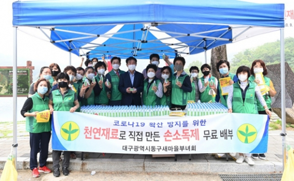 대구 동구 새마을부녀회(회장 장경숙)는 사회적 거리두기 2단계가 연장된 가운데 코로나19 위기극복 노력에 발맞춰 17일 봉무공원 일대에서 직접 제작한 손소독제 2,000개를 무료로 배부하는 행사를 실시했다.