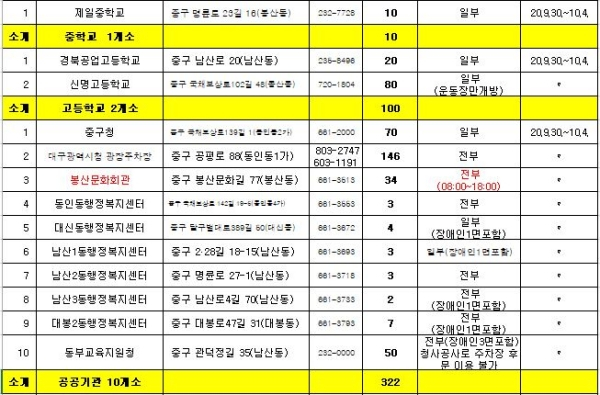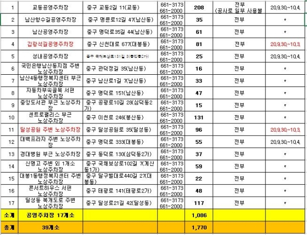 개방 주차장은 대구 중구에서 운영·관리중인 공영주차장 17개소 1,086면과 공공기관 10개소 322면, 초·중·고 12개소 362면으로 총 39개소 1,770면이다.