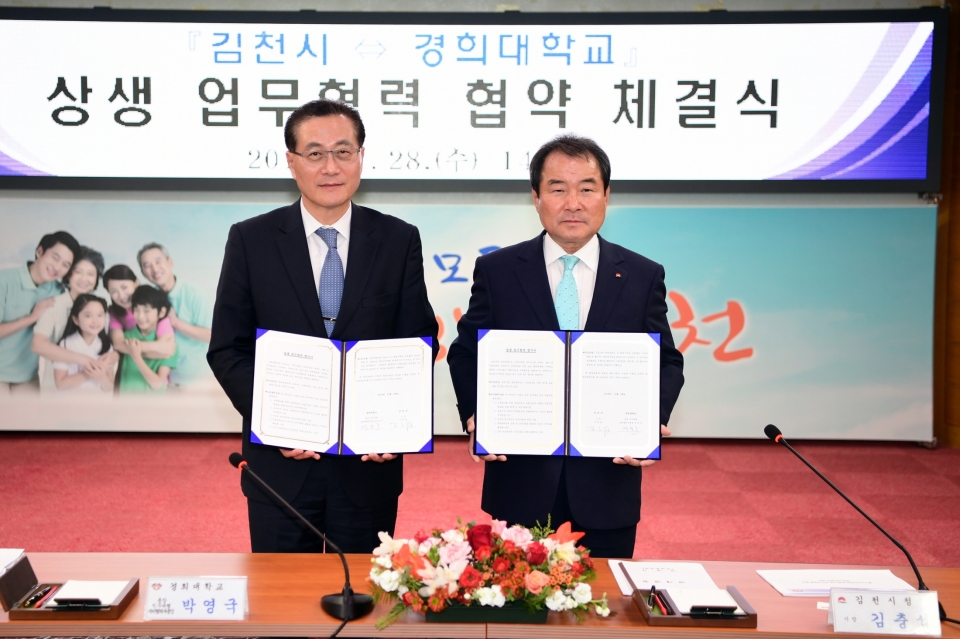김천시(시장 김충섭)은 28일 오후 2시 김천시청 회의실에서 세계적인 명문사학인 경희대학교(총장 직무대행 박영국 대외협력부총장)과 상생업무협력을 위한 협약서를 체결했다고 밝혔다.