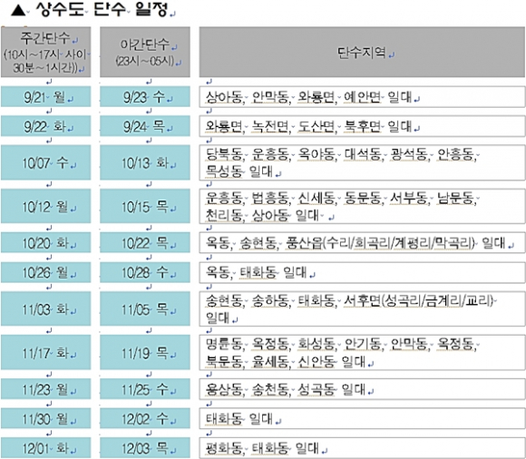 9월 21일부터 12월 3일까지 동지역과 읍면지역(풍산읍, 북후면, 와룡면, 서후면, 예안면, 도산면, 녹전면) 일원에서 주‧야간 특정시간에 일정에 따라 단수가 될 예정이다.