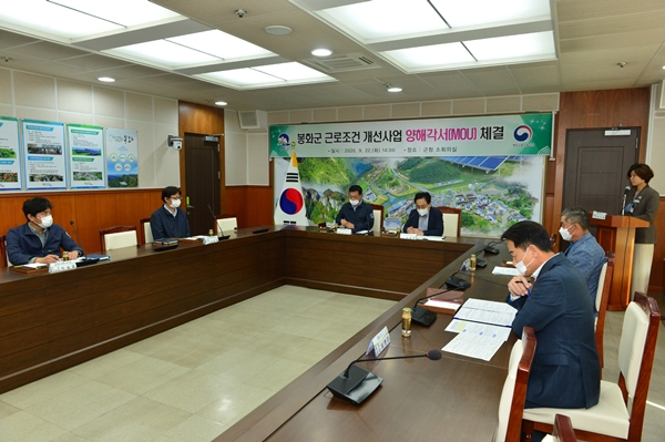 봉화군(군수 엄태항)은 공무직근로자 근로조건 개선을 위해 고용노동부 영주지청(지청장 김일섭, 이하 영주지청)과 지난 9월 22일(화) 오후 2시, 봉화군청 소회의실에서 양해각서(MOU)를 체결했다.