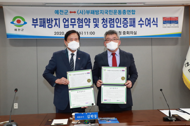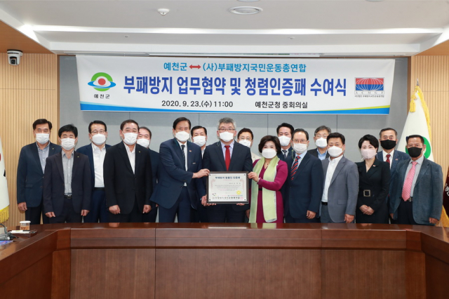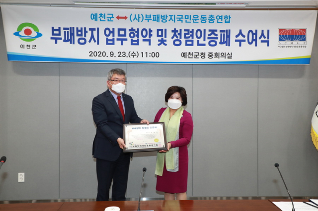 김학동 예천군수는 9월 23일 오전 11시 군청 중회의실에서 국민권익위 산하 (사)부패방지국민운동총연합 전재용 전국여성중앙회장 등이 참석한 가운데 ‘부패방지 청렴인 인증패’를 수상했다.