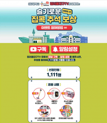 대구시는 보다 많은 시민과 구독자들이 영상을 즐길 수 있도록 24일부터 18일간 유튜브 구독 이벤트를 함께 진행한다. ‘컬러풀대구TV’ 유튜브 채널을 구독하고 대구시 페이스북 채녈에 인증 댓글을 남기면 추석 명절에 걸맞은 실속 있는 경품(1등 무선청소기, 2등 스마트워치 등)을 받을 수 있다.