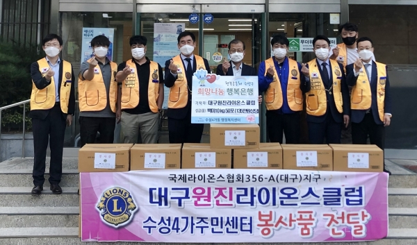 대구 국제라이온스협회 356-A(대구)지구 원진라이온스클럽(회장 문지환)은 지난 21일 수성4가동 행정복지센터를 방문해 추석을 맞아 어려움을 겪고 있는 이웃들에게 써달라며 백미10kg 50포(135만 원 상당)를 전달했다.