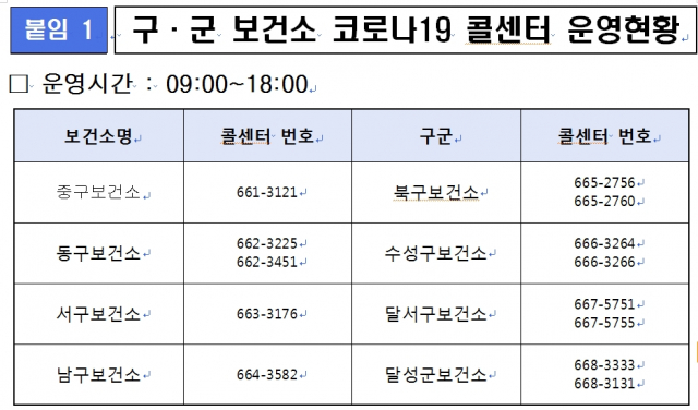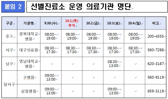 명절 연휴기간 중 구·군 보건소에서는 선별진료소를 정상 운영한다. 코로나19 상담 콜센터를 통해 선별진료소 방문 전 사전 검사문의 및 상담, 예약이 가능하다. 구·군 코로나19 콜센터 번호와 추석 명절 연휴기간 중 운영하는 의료기관 선별진료소 현황은 대구시와 구·군 홈페이지 등에서 확인할 수 있다.