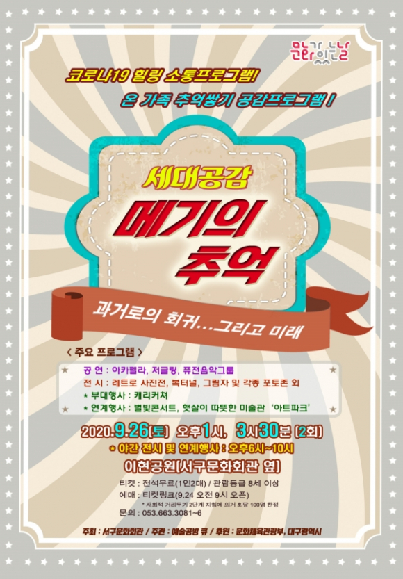 세대공감 ‘메기의 추억’ 시리즈는 2020년 문화체육관광부 ‘문화가 있는 날 지자체 특별기획프로그램’ 공모사업으로 대구 경북권에서는 유일하게 선정되었으며, 총사업비 2억 원(국비1억, 시비5천, 구비5천)으로 문화가 있는 날 주간에 총 5회에 걸쳐 시행되는 문화 사업이다.