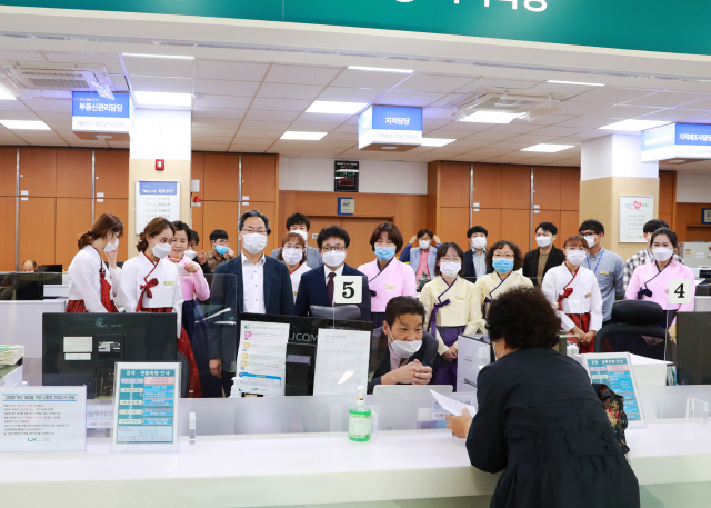 1층 종합민원과에서 오도창 영양군수(가운데)와 한복차림의 직원들이 민원인을 맞이하고 있다.