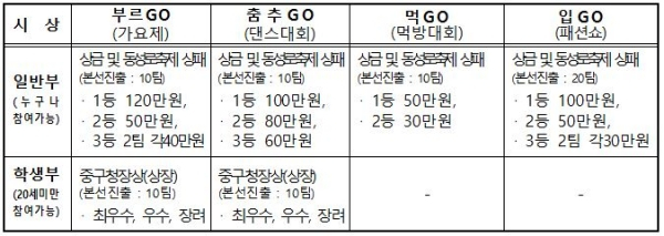 특히 학생부 참여도가 높은 가요제, 댄스대회의 경우 본선 진출팀을 일반부와 학생부로 나누어 각 10팀을 선발하고, 학생부 10팀 중 각 3팀에게는 중구청장상을 수여하여 앞으로 미래의 꿈나무들을 격려할 예정이다.