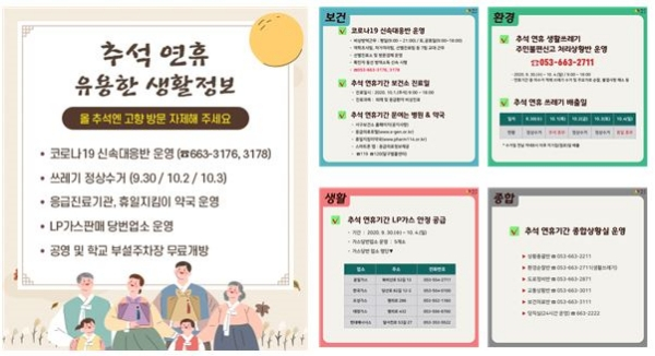 또한 추석 연휴기간 동안 주민들에게 유용한 정보를 제공하기 위해 각 부서별로 제공하던 정보인 ▶당번 병·의원 현황 ▶LPG가스당번 업소 ▶공영주차장 개방 ▶쓰레기 수거 등을 한곳에 모아 홈페이지, 블로그, 밴드, 인스타그램, 페이스북을 통해 쉽게 알 수 있도록 제공한다.