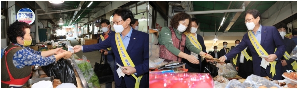 김대권 대구 수성구청장은 29일 추석을 앞두고 만촌2동 청구시장을 찾아 코로나19로 어려움을 겪고 있는 상인들을 격려하고, 전통시장을 활성화하기 위한 장보기 행사에 참여했다.