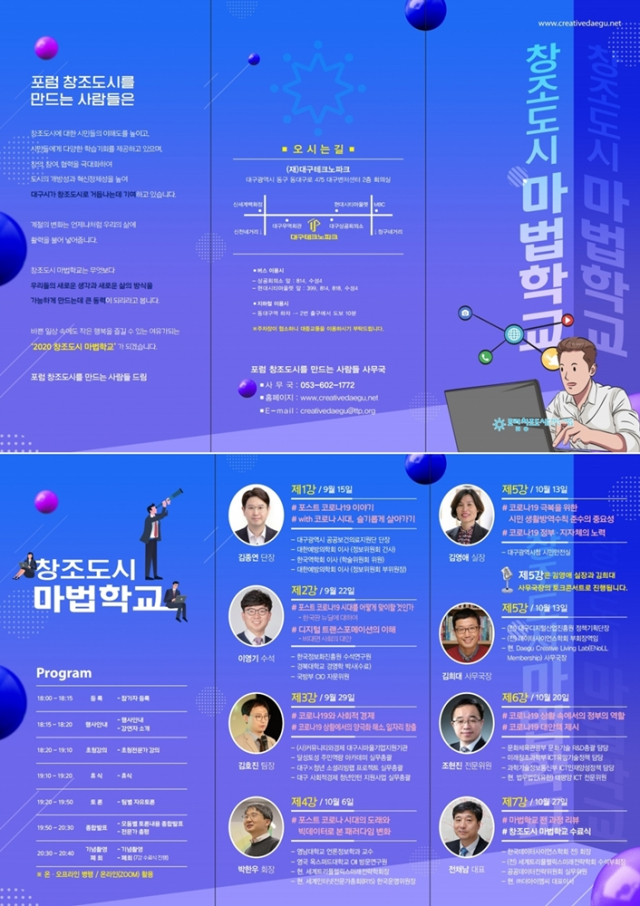 이번 마법학교의 주제는 ‘코로나19 이후의 Big Change’로 코로나19 이후 다가올 변화와 대응에 대해 7회에 걸쳐 전문가 강의와 모둠별 토의로 시민들의 다양한 가치와 각자가 겪은 코로나19에 관한 경험담을 공유하는 시간을 가진다. 참여는 코로나19 확산 방지를 위해 기존의 대면 방식과 온라인 플랫폼 ‘줌’으로 접속하는 비대면 방식으로 할 수 있다. 온라인 참여에 관심 있는 시민은 포럼창조도시 사무국(053-602-1772)으로 문의하면 된다.