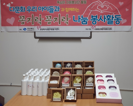 (사)봉화군종합자원봉사센터의 지원으로 실시한 이번 봉사활동은 다문화가정의 부모와 자녀가 각 가정에서 한방수제샴푸와 천연비누 만들기 체험을 갖고, 만들어진 물품 100여 개를 지역 독거노인과 요양시설 입소자들에게 기부하는 방식으로 진행됐다.